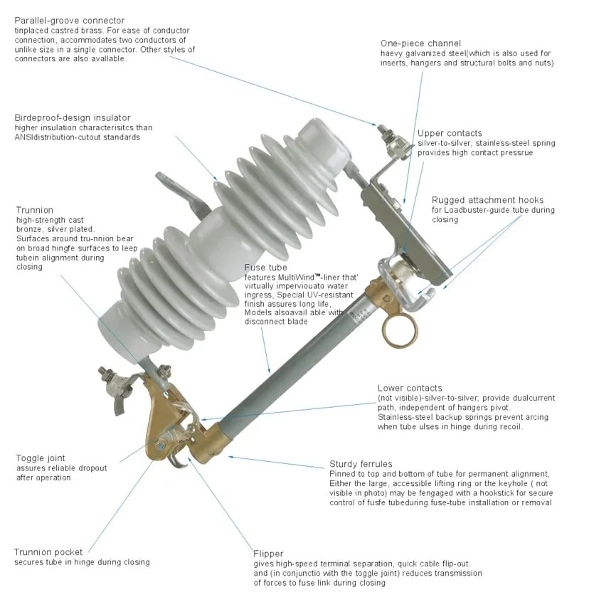 கோம்வில் தொழிற்சாலையின் உயர் மின்னழுத்த டிராப் அவுட் செராமிக் ஃபியூஸ் கட்அவுட் ஹோல்டருடன் ஒரு ஒருங்கிணைந்த அலகு ஆகும். இது இரண்டு முக்கிய பகுதிகளைக் கொண்டுள்ளது. ஒரு பகுதி உருகி அசெம்பிளி ஆகும். மற்ற பகுதி துண்டிப்பு சுவிட்ச் ஆகும். ஃபியூஸ் கட்அவுட் வழியாக அதிகப்படியான மின்னோட்டம் செல்லும் போது, ​​உருகி உறுப்பு உருகும். இது பெரும்பாலும் உருகியை "ஊதுவது" என்று குறிப்பிடப்படுகிறது. உருகி உறுப்பு உருகியவுடன், சுற்று உடனடியாக திறக்கும். இந்த செயல் முக்கிய சக்தி மூலத்திலிருந்து தவறான பகுதியைத் துண்டிக்கிறது.